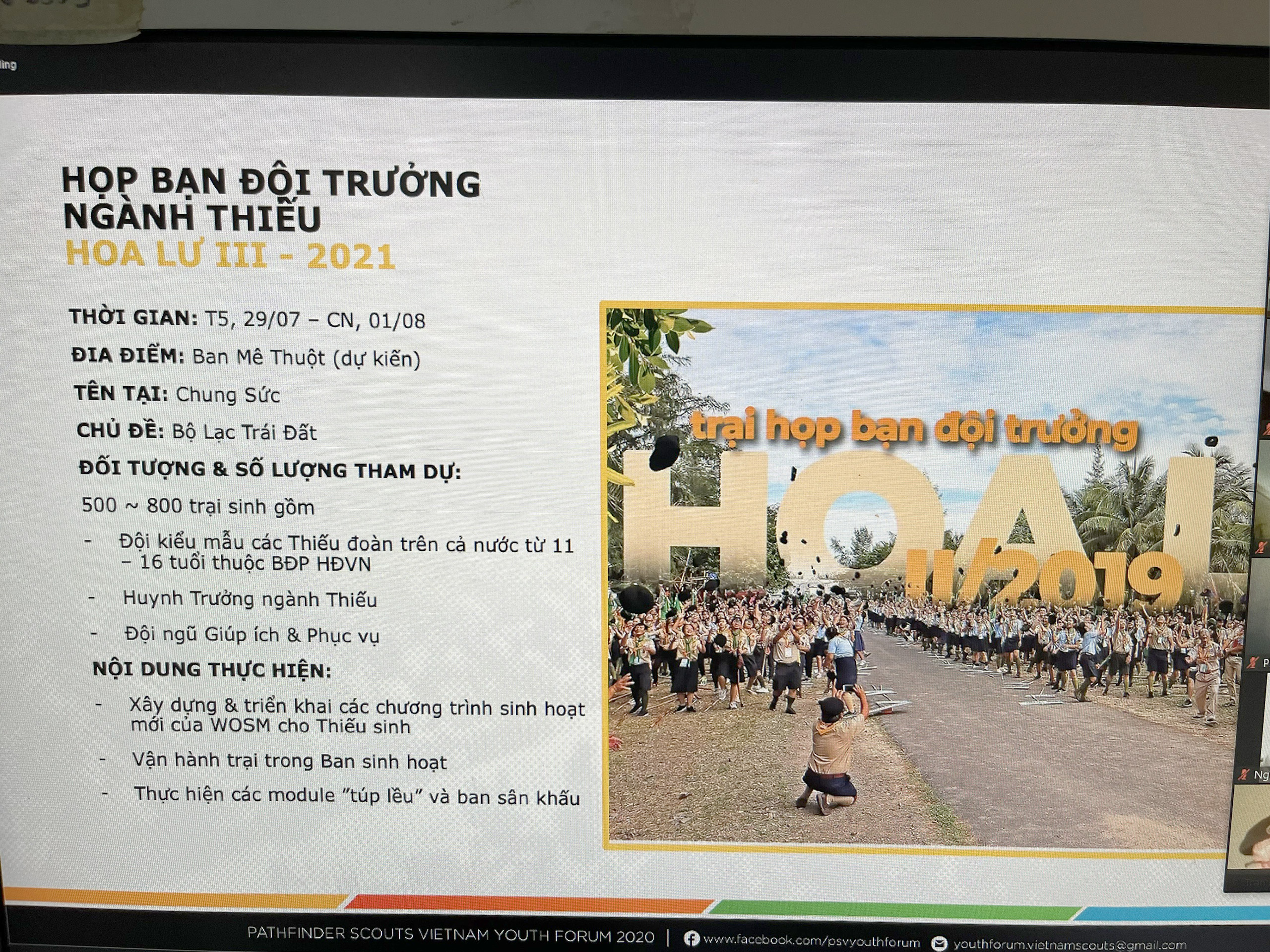 Vào ngày 11 tháng 06 năm 2021 Hội nghị Hướng đạo Quốc gia Online đã được tổ chức theo đúng thể thức. Đã có 33 Huynh trưởng tham dự.