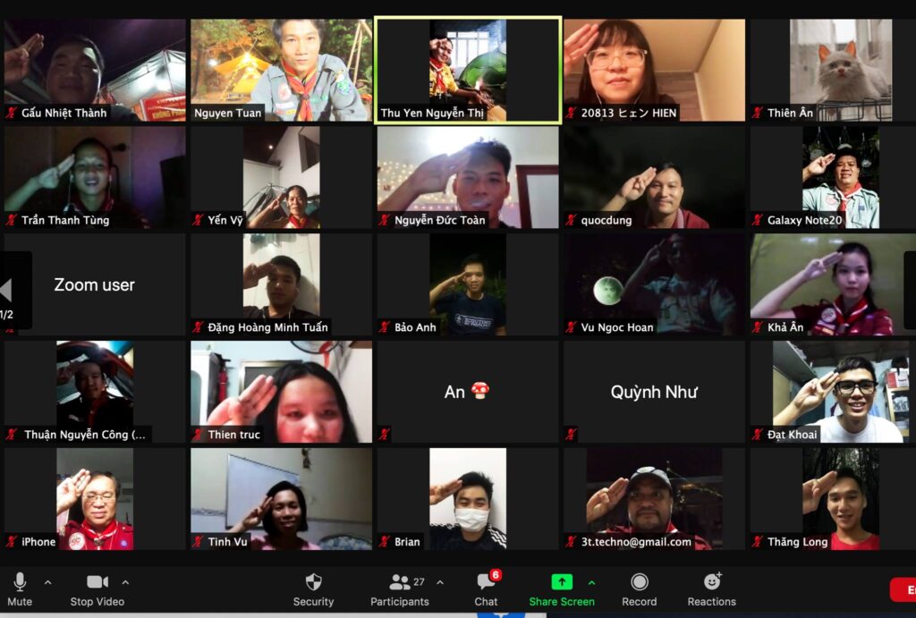 Chúng tôi làm nghi thức chào cờ hướng đạo thật đặc biệt qua màn hình máy tính, Smartphone, nhưng xúc động lắm. Được nhìn thấy khuôn mặt thân thương của nhau, nghe được giọng nói ngọt ngào ấm áp của nhau như đã xa nhau lâu lắm, mừng rớt nước mắt. Chúng tôi lắng nghe chia sẻ của từng người, đầu tiên là câu chuyện của trưởng Vũ ngọc Hoàn nhà trưởng cũng nằm trong phường Bình Chiểu đã bị phong tỏa, trưởng kể mới hôm nay trước nhà cũng có ca nghi nhiễm, trưởng nhắc nhở về tinh thần hướng đạo và mời mọi người chia sẻ. Chúng tôi láng nghe câu chuyện của một tráng sinh F0 đang điều trị chia sẻ về trải nghiệm nhiễm bệnh, quá trình lây nhiễm, phát hiện, chữa trị, tinh thần khi biết mình bị F0, những sự chuẩn bị khi vào khu cách ly, khi vào bệnh viện điều trị, những tác dụng gây ra trên cơ thể của virus….. Thắng chia sẻ những sự động viên kịp thời của anh em tay trái khiến em rất xúc động và tăng thêm tinh thần rất nhiều, hiện tại em ổn, vẫn vận động thể dục, ăn uống đầy đủ để tăng đề kháng. Một chia sẻ khiến chúng tôi rất xúc động là trong bệnh viện, các bệnh nhân cũng quan tâm và giúp đỡ nhau nhiều, thắng cũng dùng tinh thần giúp ích của tráng sinh để giúp đỡ những bệnh nhân khác, hỗ trợ đội ngũ y tế những việc nhỏ. Qua màn hình nhỏ, tôi thấy một tráng sinh tráng đoàn Hùng Vương, liên đoàn Diên Hồng đang làm công tác ở một chốt gác covid, một tráng sinh xông pha nơi tuyến đầu phòng dịch. Có tráng sinh đang trong khu cách ly sản xuất của công ty nhiều ngày không về nhà. Akela Yến Vỹ đang trong khu vực phong tỏa P. Long Thạnh Mỹ chia sẻ những ưu tư, muốn triển khai những dự án giúp ích cho những người khó khăn trong khu xóm. Nhiều tráng sinh đang cộng tác với những nhóm thiện nguyện trong việc trao quà đến những gia đình rất khó khăn, thiếu thực phẩm…. Trưởng Tịnh chia sẻ nhắc nhở dù các việc giúp ích là rất cần thiết, nhưng bảo vệ sức khỏe của từng tráng sinh, trưởng và gia đình cũng rất là quan trọng. Trưởng Trần Khả Ân chia sẻ về sinh hoạt trực tuyến của thiếu đoàn Quang Trung, huấn luyện đội kiểu mẫu online, các đội họp đội online. Kế hoạch mở khóa Cơ Bản online cho tráng sinh của đạo XH3….