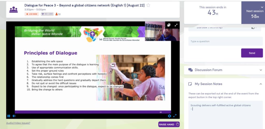 Năm nay tháng 8/2021, cùng với Ban Đại Diện Hướng Đạo Sinh Trẻ Việt Nam, mình tham dự Diễn đàn Hướng Đạo Sinh Trẻ Thế Giới. Phiên bế mạc kết thúc khi đồng hồ đã điểm 12h đêm Chủ Nhật hôm qua, mặc dù mỗi người một nơi với chiếc màn hình laptop nhưng mình thấy thật xúc động và quyến luyến. Tham dự trực tuyến đã thế này thì chắc hẳn nếu có cơ hội tham gia trực tiếp tại Ai Cập (nếu không có COVID) thì sẽ tuyệt vời đến nhường nào. Và như mọi lần, lần này mình vẫn có thật nhiều cảm xúc.