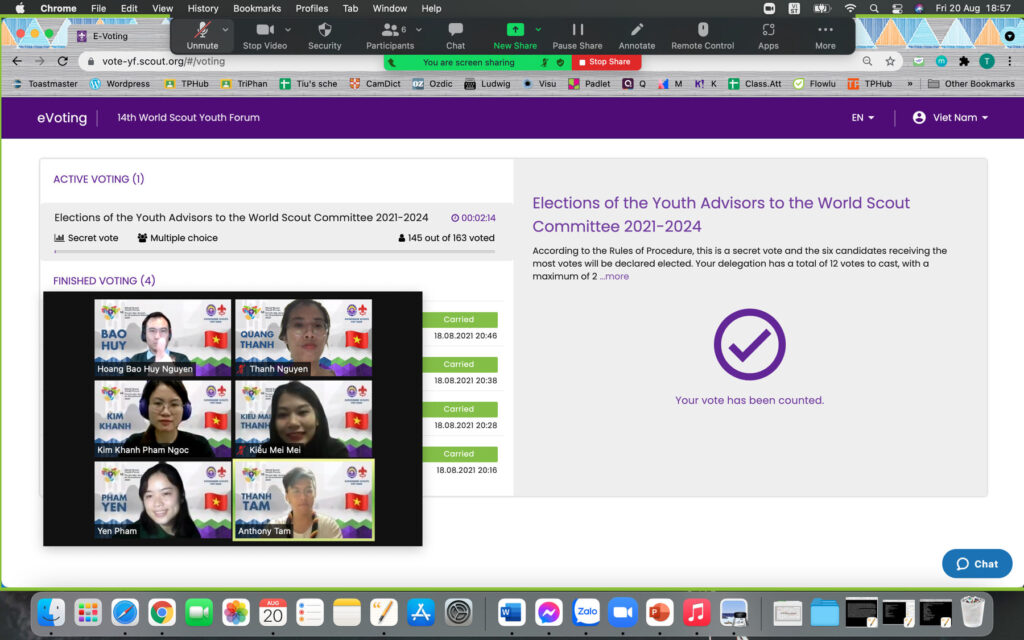 Năm nay tháng 8/2021, cùng với Ban Đại Diện Hướng Đạo Sinh Trẻ Việt Nam, mình tham dự Diễn đàn Hướng Đạo Sinh Trẻ Thế Giới. Phiên bế mạc kết thúc khi đồng hồ đã điểm 12h đêm Chủ Nhật hôm qua, mặc dù mỗi người một nơi với chiếc màn hình laptop nhưng mình thấy thật xúc động và quyến luyến. Tham dự trực tuyến đã thế này thì chắc hẳn nếu có cơ hội tham gia trực tiếp tại Ai Cập (nếu không có COVID) thì sẽ tuyệt vời đến nhường nào. Và như mọi lần, lần này mình vẫn có thật nhiều cảm xúc.