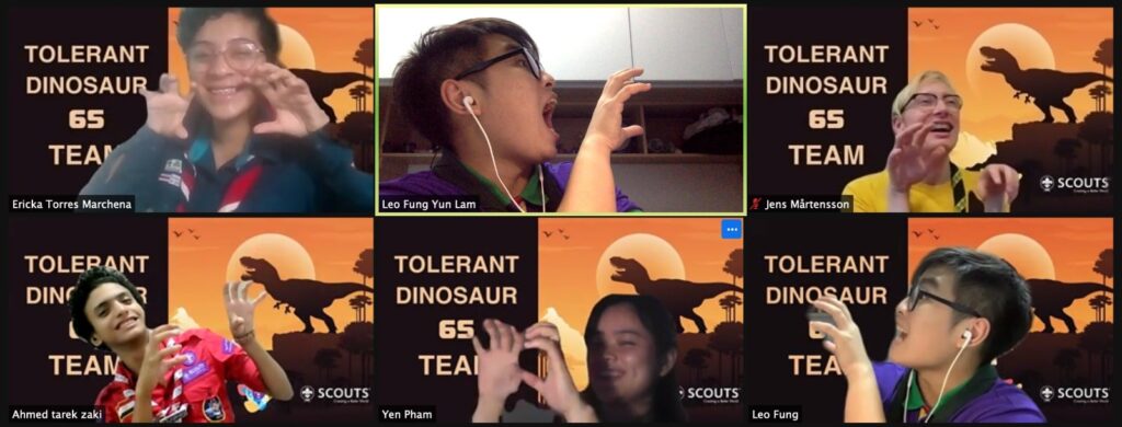 – Luôn mong chờ cuộc họp International Team. Hôm đầu tiên thì chúng mình cùng chơi Rally game như giải mật thư, trả lời các câu hỏi hiểu biết chung về các sự kiện liên quan đến Diễn đàn Hướng Đạo Sinh Trẻ và các sự kiện lịch sử Hướng Đạo Thế giới, hay kiểu đơn giản như “Đếm số người trong ảnh” – mặc dù lúc đó (sau khi tham dự phiên khai mạc 3 tiếng đồng hồ) đây là câu siêu khó và xoẵn não với team mình. Ngày thứ hai thì phiên toàn thể kết thúc khá muộn nên trong buổi họp International Team, chúng mình chủ yếu là chuyện phiếm, hỏi han xem hôm nay tham dự thế nào và bình luận về các ứng viên ứng cử Ban Đại Diện HĐS Trẻ Thế Giới. Ngày thứ 3 và ngày thứ 4 thì chúng mình tiếp tục họp team, nhưng nội dung xoay quanh bản đề xuất Tuyên bố của Diễn đàn và bản Điều chỉnh Nghị quyết Hội nghị. Và dù nội dung của buổi họp team là gì thì kết thúc luôn là nghi thức “chụp ảnh” team theo style “khủng long” – tên mình trót đặt cho International Team của mình, cụ thể hơn là Khủng long bao dung (Tolerant Dinosaur).