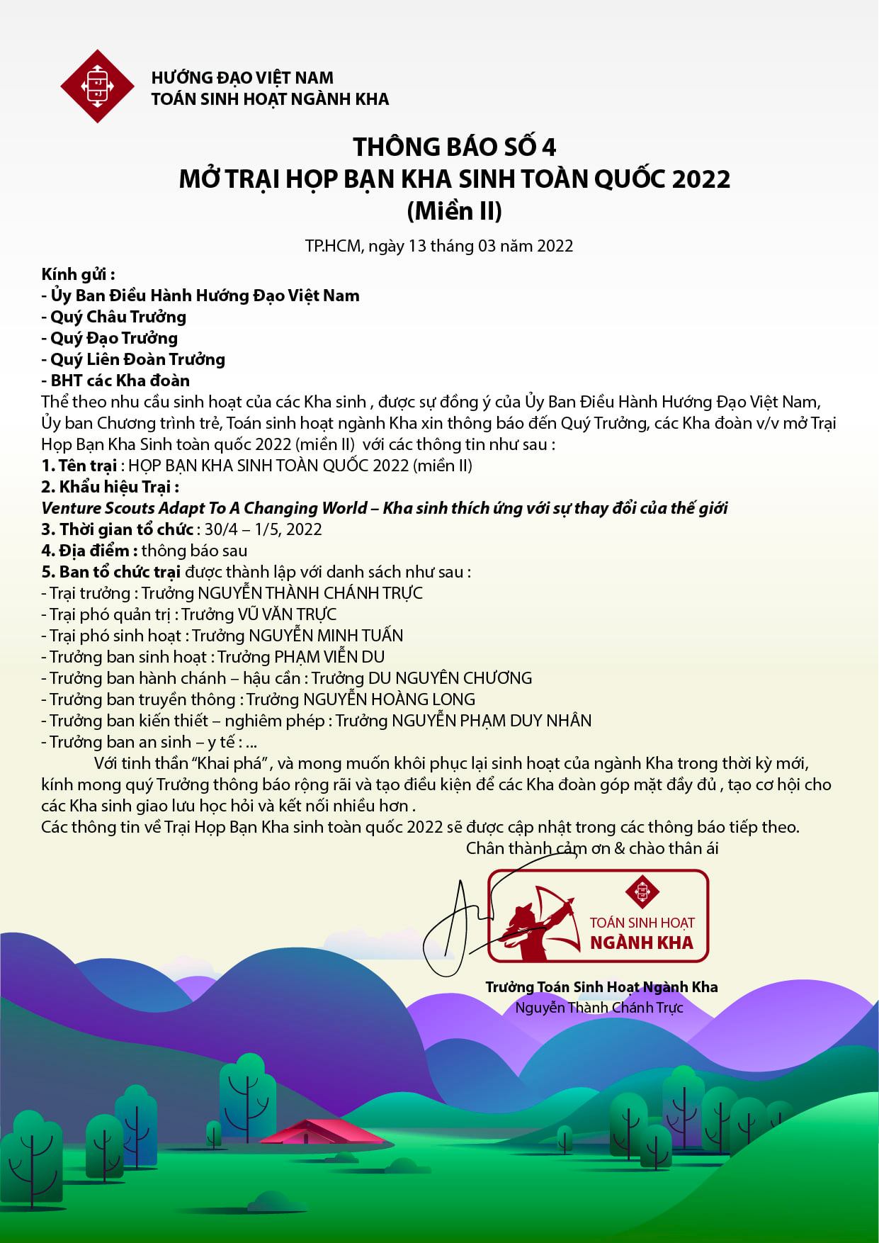 Tin trong nước Thông báo số 4: Trại họp bạn Kha sinh toàn quốc 2022 Đăng ngày Tháng 3 12, 2022 bởi admin